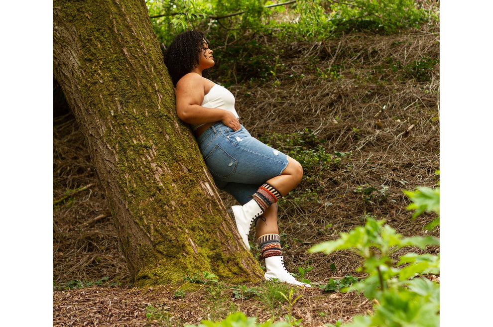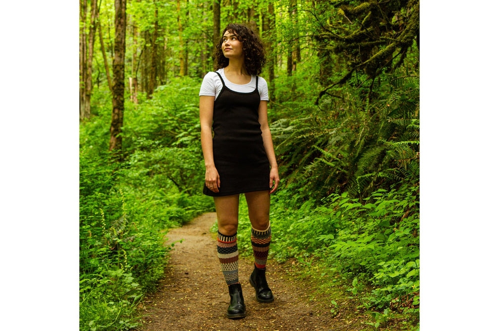 Much like the spice, our Nutmeg Knee Socks have a warm, yet slightly sweet design... with a little bit of a kick! Colors in this sock: creamy yellow, rustic orange, navy, blue-gray, periwinkle. Fits comfortably all calf sizes up to 15".